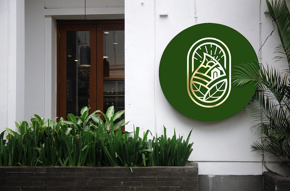 This logo is designed for stores that sell tea or coffee. It features several distinct elements, including a cottage, leaves, hills, the sun, mountains, and a droplet.